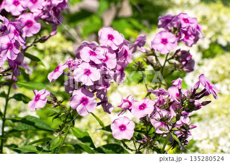 Close-up of the bright pink flowers of garden phlox (Phlox paniculata) in full bloom against background of slightly washed-out creamy white or pale yellow hydrangea (Hydrangea paniculata) flowers.