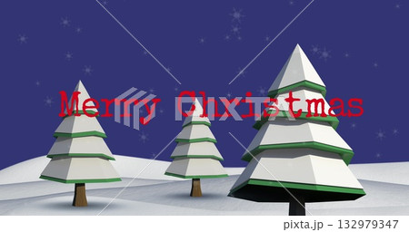 Featuring Christmas tree at night, with falling snowflakes and red Merry Christmas, copy space