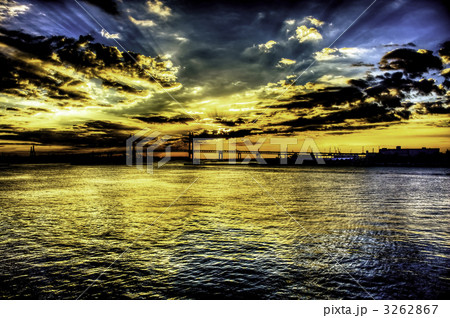 日の出の横浜ベイブリッジ(横浜市中区、大さん橋より)