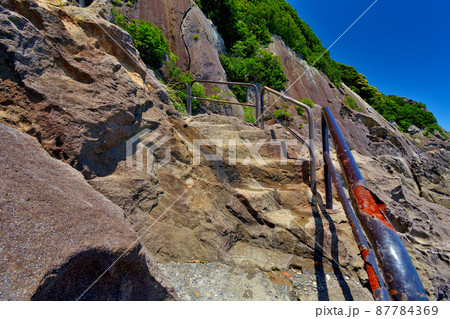 鬼ヶ城・鰐岩付近の眺め、険しい海岸線と、そこを通る遊歩道・世界遺産・熊野・三重県熊野市(2)