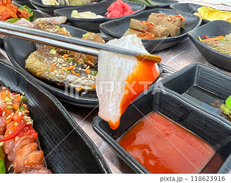 Korean seafood dish. raw fish Sashimi