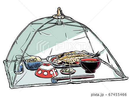 蠅帳を被せたアジの開きが主菜の1人分の食事 筆描き・2色塗り