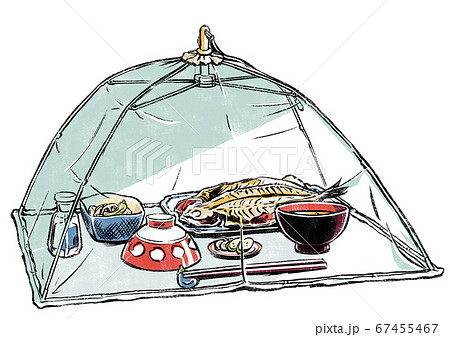 蠅帳を被せたアジの開きが主菜の1人分の食事 筆描き・マット塗り