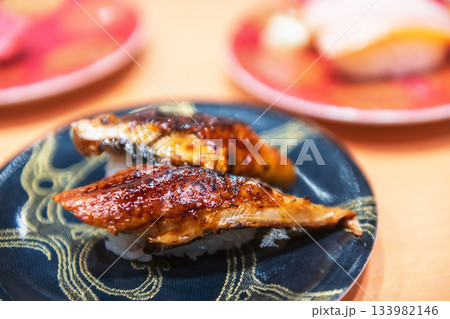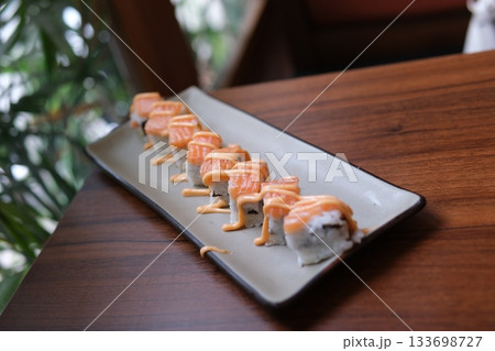 Eel fish sushi, sashimi Nigiri Platter, japanese sushi restaurant, Fresh Tuna and Salmon Slices in modern cafe, traditional food, raw red fish dish, omega 3.