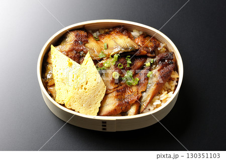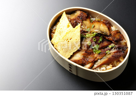 曲げわっぱ入り鰻丼弁当を黒背景で撮影
