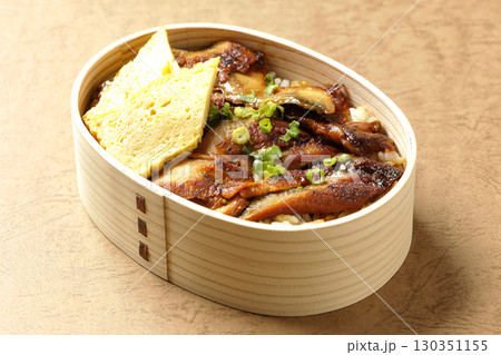 曲げわっぱ入り鰻丼弁当を白背景で撮影