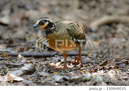 タイなど、東南アジアの熱帯雨林で見られる眼鏡のような顔つきをしたウズラの仲間チャムネミヤマテッケイ