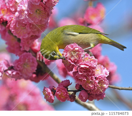 満開の紅梅でお食事中のメジロさん( 春イメージ )( ほのぼのイメージ )