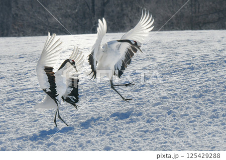 北海道で見られる日本を代表する美しい野鳥、冬の雪原の真白なタンチョウ