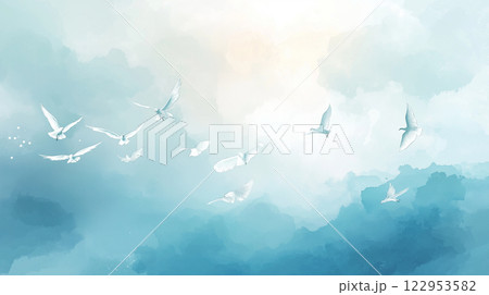 空を飛ぶ白い鳥の繊細な水彩イラスト