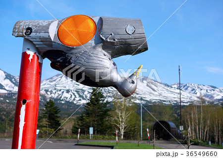 クマゲラの模型がついた視線誘導標識