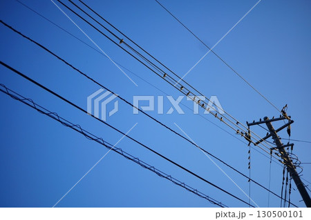 澄んだ青空に伸びる電線と並んでとまる小鳥たちのシルエット風景