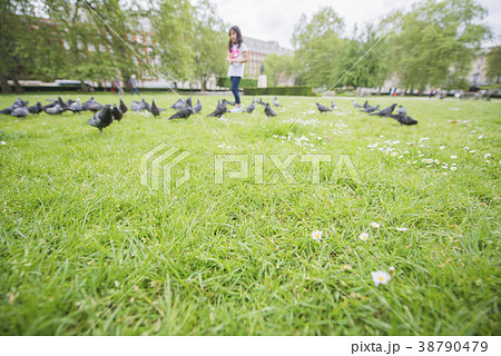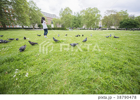 Pigeons can be seen foraging peacefully in a lovely park setting among the grass and greenery
