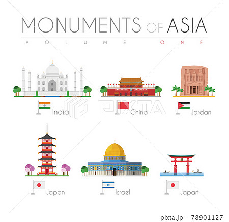 Monuments of Asia in cartoon style Volume 1: Taj Mahal (India), Forbidden City (China), Petra (Jordan), Gojunoto Pagoda (Japan), Dome of the Rock (Israel) and Miyamina Torii Gate (Japan) . Vector