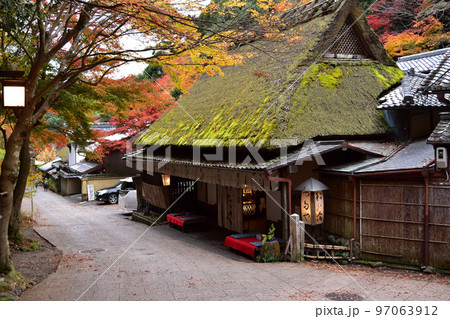 京都、嵯峨野の嵯峨鳥居本(門前町)の茅葺き屋根の茶店(平野屋)/「国指定重要伝統的建造物群保存地区」
