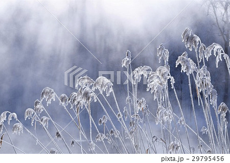 北海道・富良野・鳥沼公園・氷点下30度の朝・沼から立ち込める気嵐とすすき