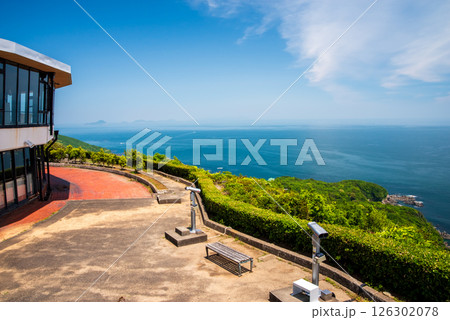 日本 三重県鳥羽市のパールロード沿いにある鳥羽展望台から見える太平洋と海女のテラス