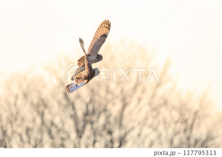 夕暮れに狩りのために葦原を飛翔する美しいコミミズク(フクロウ科)。埼玉県鴻巣市市荒川河川敷-2024