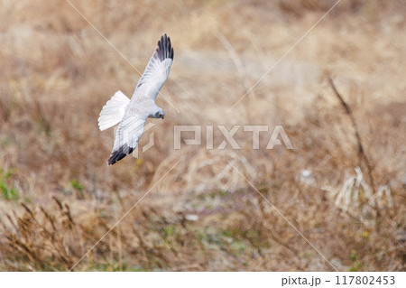 狩りのために葦原を飛翔する美しいハイイロチュウヒ(タカ科)。群馬県利根川河川敷-2024年3月