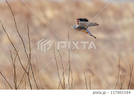 狩りのためにホバリングする美しいチョウゲンボウ(ハヤブサ科)。群馬県利根川河川敷2024年3月