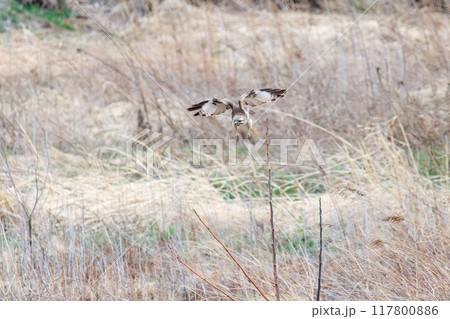 とまり木から飛び出す美しいノスリ(タカ科)。 日本国群馬県、利根川河川敷にて。 2024年3月23