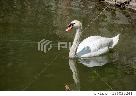Elegant mute swan with orange beak and white plumage swimming on the water in daylight.