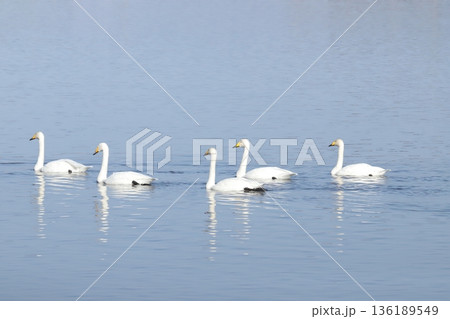 青い湖面を泳ぐコハクチョウとカモ。冬の渡り鳥の美しい風景。