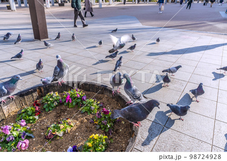 日本の横浜都市景観 地下鉄 センター南駅前のハト。突然、群れが飛来…