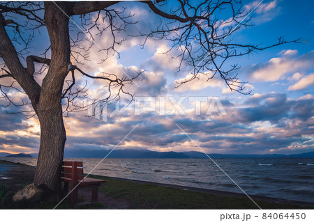 滋賀県彦根市の琵琶湖湖畔に設置されたベンチを撮影したもの
