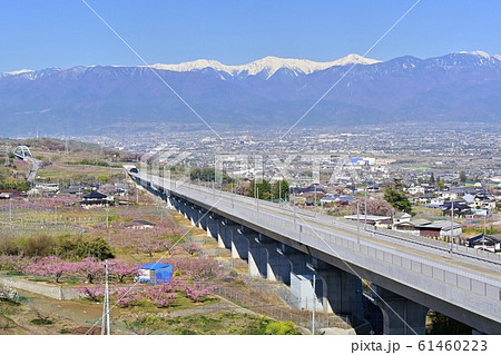 花咲く桃畑とリニア新幹線高架に試験車両と南アルプス