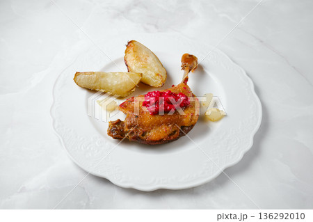 Roast duck leg with potatoes and cabbage on a ceramic plate