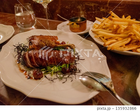 レストランで食べる鴨のローストと山盛りのフライドポテト