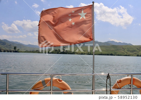 北朝鮮の国境をゆく観光船の甲板と中国国旗