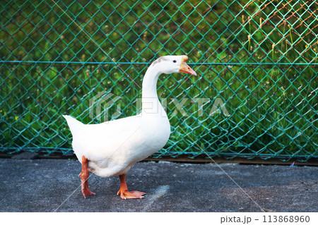 White call duck cute duck white feathers and yellow beak, Call duck is on glass field, Animal life.