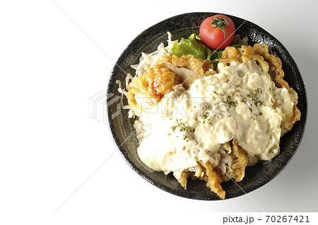 ミニトマトなど野菜も一緒に乗っているタルタルソースたっぷりの熱々のチキン南蛮丼(白背景、俯瞰)
