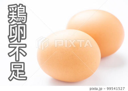 鳥インフルエンザによる鶏卵不足イメージ。鶏卵(生卵)2個の横に「鶏卵不足」の文字。(白バック)