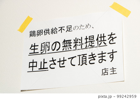 鶏卵供給不足による生卵の無料提供中止に関する貼り紙。