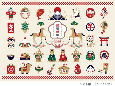 2026年 午年 和風フレームとお正月の縁起物イラストセット