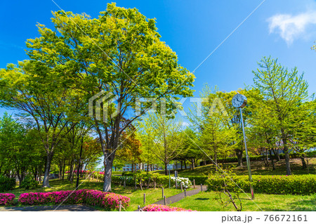 緑になった丘の公園と春の青空
