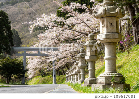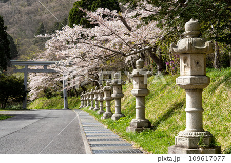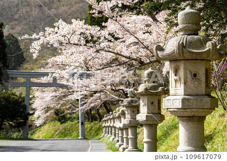石灯籠と満開の桜の風景