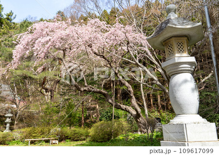 函館八幡宮の石灯篭と枝垂れ桜の風景