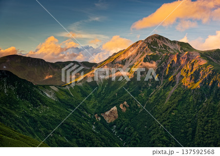北アルプス・双六小屋から見る残照の鷲羽岳・祖父岳