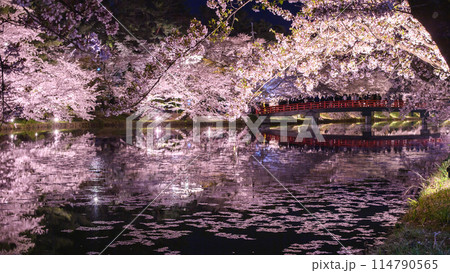 弘前城満月の夜 ライトアップされた花筏の西濠と満開の桜に囲まれる春陽橋 青森県
