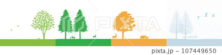ログハウスと動物と樹木の四季の変化のシルエットイラスト