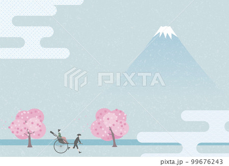 日本の富士山と桜の木と人力車とエ霞の背景イラスト