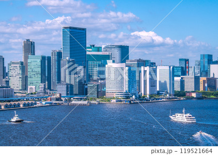 日本の東京都市景観 竹芝や東京駅、日本橋、勝どき方向などを望む。奥に水上バスやスカイツリー=13日