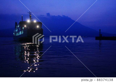 夏の夜明け前の桜島をバックに鹿児島港を出港するフェリー