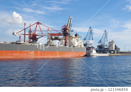 茨城 鹿嶋 鹿島臨海工業地帯 鹿島製鉄所岸壁に停泊中の貨物船