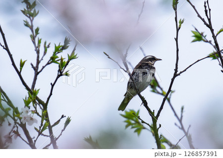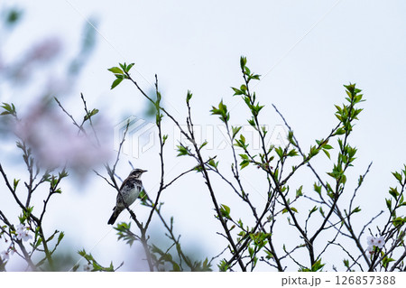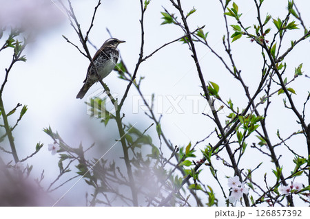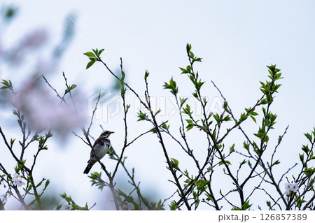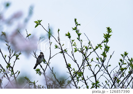 うららかな春空を背景に桜の木と公園風景 観光スポット 道の駅「水辺プラザかもと」
