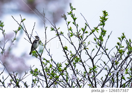 うららかな春空に映える桜の木と小川風景 道の駅「水辺プラザかもと」